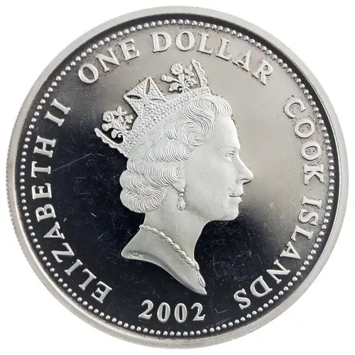 | Obverse lettering | ELIZABETH II ONE DOLLAR COOK ISLANDS RDM 2002 |