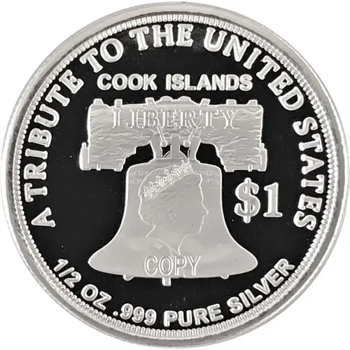 | Obverse lettering | A TRIBUTE TO THE UNITED STATES COOK ISLANDS LIBERTY $1 IRB COPY 1/2 OZ .999 PURE SILVER |