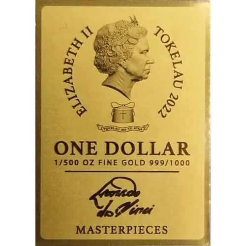| Obverse lettering | ELIZABETH II TOKELAU 2022 TOKELAU MO TE ATUA ONE DOLLAR 1/500 OZ FINE GOLD 999/1000 Leonardo da Vinci MASTERPIECES |
