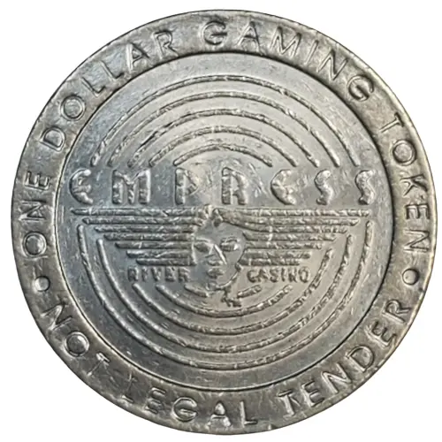 Opschrift voorzijde ONE DOLLAR GAMING TOKEN EMPRESS RIVER CASINO NOT LEGAL TENDER