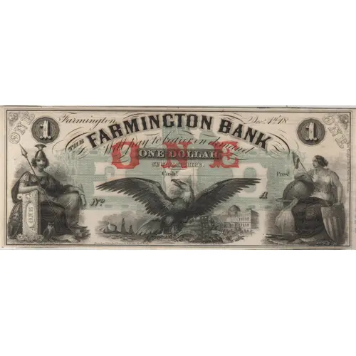 ONE 1 Farmington Dec. 4th 18___ 1 ONE THE FARMINGTON BANK New England Bank Note Co. Boston Will pay to bearer on demand ONE ONE DOLLAR NEW-HAMPSHIRE _______________________Cash.ʳ _______________________Pres.ᵗ Rawdon, Wright, Hatch & Edison, New York |