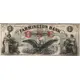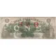 Two allegorical figures seated at left and right. The one on the left holds a scroll and spear, with a shield by her side and an owl and books at her feet. The one on the right holds a spear raising a Phrygian cap on the end and the American crest at her feet. In the center, an eagle with outstretched wings holding the American crest in one paw, on the left a sailing boat and on the right a building. The ONE in red is an overprint intended to protect against counterfeiting. |