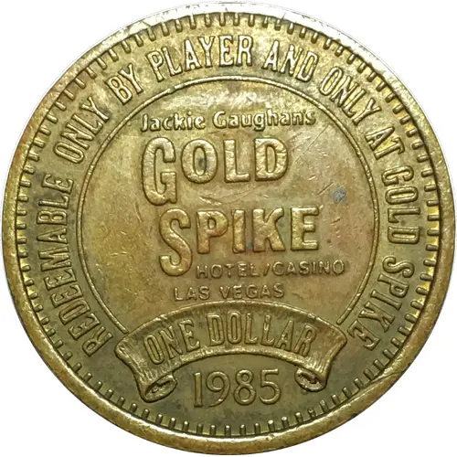 REDEEMABLE ONLY BY PLAYER AND ONLY AT GOLD SPIKE Jackie Gaughn`s GOLD SPIKE HOTEL/CASINO LAS VEGAS ONE DOLLAR 1985 |