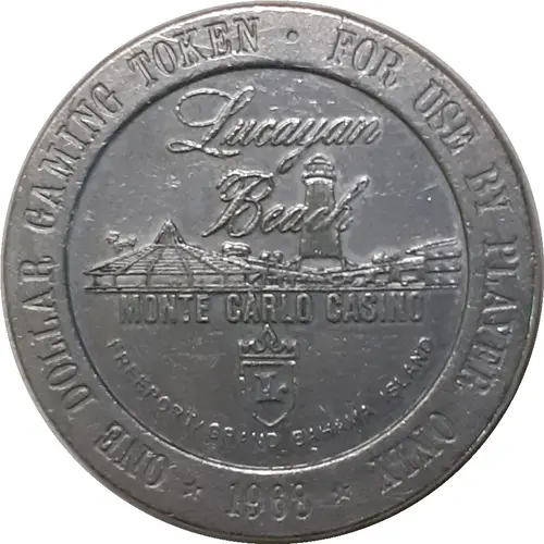 | Obverse lettering | ONE DOLLAR GAMING TOKEN • FOR USE BY PLAYER ONLY Lucayan Beach MONTE CARLO CASINO L FREEPORT / GRAND BAHAMA ISLAND ★ 1968 ★ |