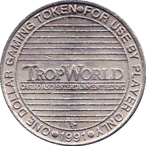 | Obverse lettering | TROPWORLD CASINO AND ENTERTAINMENT RESORT ONE DOLLAR GAMING TOKEN FOR USE BY PLAYER ONLY gd 1991 |