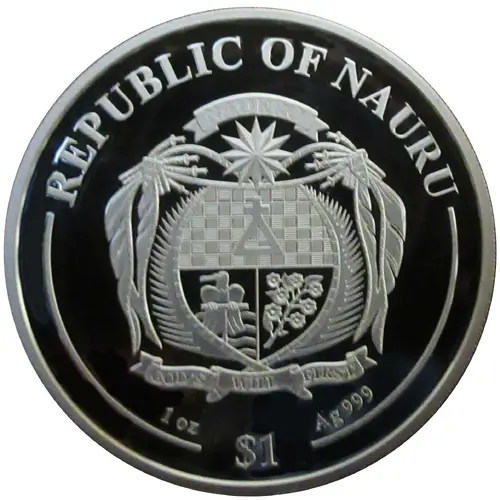 | Obverse lettering | REPUBLIC OF NAURU NAOERO GOD`S WILL FIRST 1 OZ Ag 999 $1 |