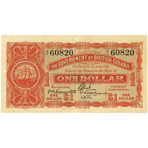 | Подпись(и) | varieties. Black serial numbers, date and signatures. Script: Latin Lettering: THE GOVERNMENT OF BRITISH GUIANA Promisse to pay yhe Bearer on Demand the Sum of ONE DOLLAR `DAMUS PETIMUSQUE VICISSIM` Georgetown Currency Comissioners ONE DOLLAR $1 $1 ONE D |