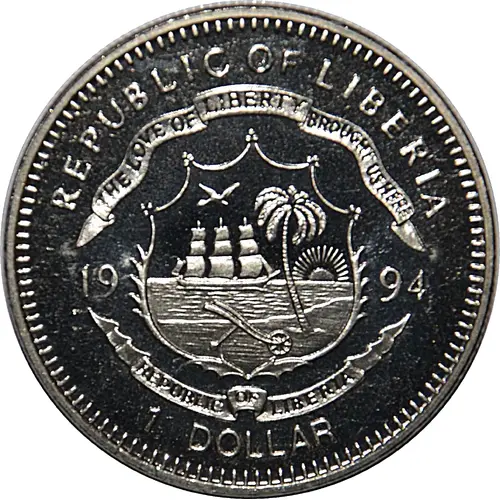 | Obverse lettering | REPUBLIC OF LIBERIA THE LOVE OF LIBERTY BROUGHT US HERE 19 94 PM REPUBLIC OF LIBERIA 1 DOLLAR |