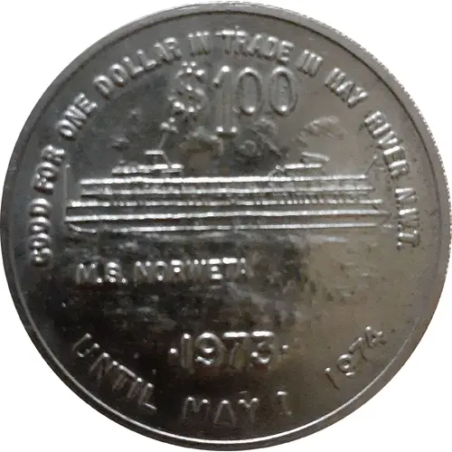 | Obverse lettering | GOOD FOR ONE DOLLAR IN TRADE IN HAY RIVER N.W.T. MACKENZIE PLACE TALLEST BUILDING NORTH OF 60 UNTIL MAY 1, 1976 |