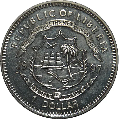 | Obverse lettering | REPUBLIC OF LIBERIA THE LOVE OF LIBERTY BROUGHT US HERE 19 97 PM REPUBLIC OF LIBERIA 1 DOLLAR |
