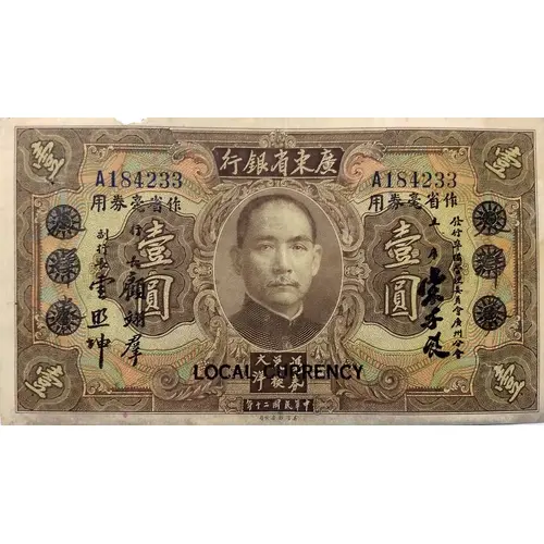 | Obverse description | Brown on multicolor underprint. Sun Yat Sen center. Black overprint `LOCAL CURRENCY` Black vertical signature/flower overprints left and right. Red or blue serial numbers. |