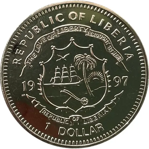 | Obverse lettering | REPUBLIC OF LIBERIA THE LOVE OF LIBERTY BROUGHT US HERE 19 97 PM REPUBLIC OF LIBERIA 1 DOLLAR |