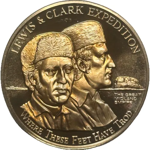 | Obverse lettering | LEWIS & CLARK EXPEDITION THE GREAT MIDLAND EMPIRE Where These Feet Have Trod |