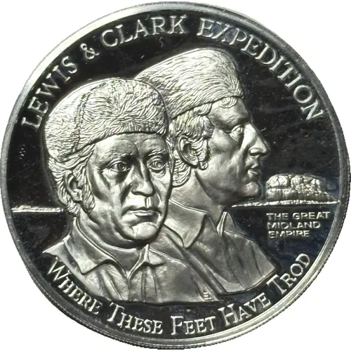 | Obverse lettering | LEWIS & CLARK EXPEDITION THE GREAT MIDLAND EMPIRE Where These Feet Have Trod |
