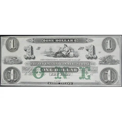| Obverse lettering | 1 ONE DOLLAR 1 1 1 THE PRESIDENT, DIRECTORS & CO., OF THE NEW ENGLAND COMMERCIAL BANK Will pay ONE DOLLAR on demand ONE to the bearer NEWPORT____________18___ NEW ENGLAND BANK NOTE CO., BOSTON. 1 _____________ Cash.ʳ______________Pres.ᵗ 1 RHODE ISLAND |
