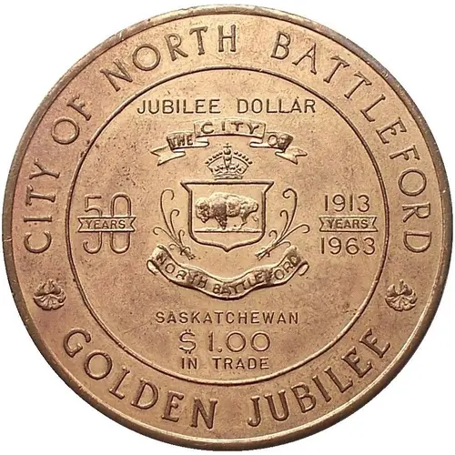 CITY OF NORTH BATTLEFORD JUBILEE DOLLAR 50 YEARS 1913 1963 SASKATCHEWAN $ 1.00 IN TRADE GOLDEN JUBILEE |