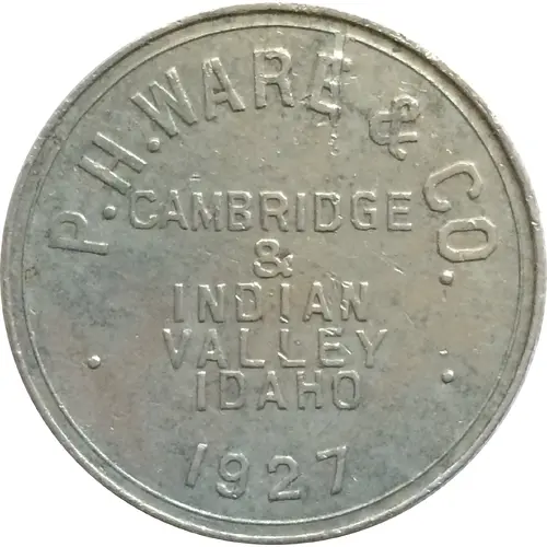 | Obverse lettering | P.H. WARE & CO. CAMBRIDGE & INDIAN VALLEY IDAHO 1927 |