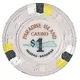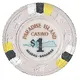 Three sets of white, black, and yellow stripes at 12 o`clock, 4 o`clock, and 8 o`clock on a gray poker chip. Eight embossed designs of a top hat in front of a cane around the outer ring. White center with silhouette of Paradise Island behind denomination surrounded by legend. |