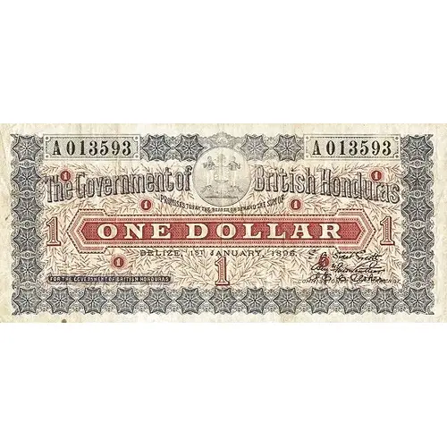 The Government of British Honduras PROMISE TO PAY THE BEARER ON DEMAND THE SUM OF ONE DOLLAR BELIZE, 1st JANUARY, 1895 FOR THE GOVERNMENT OF BRITISH HONDURAS COMMISSIONERS OF CURRENCY 1 |