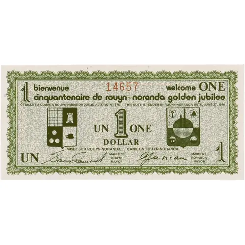 1 bienvenue welcome ONE cinquantenaire de rouyn-noranda golden jubilee CE BILLET A COURS A ROUYN-NORANDA JUSQU`AU 27 JUIN 1976 THIS NOTE IS TENDER IN ROUYN-NORANDA UNTIL JUNE 27, 1976 MISEZ SUR ROUYN-NORANDA BANK ON ROUYN-NORANDA MAIRE DE ROUYN MAYOR BRITISH AMERICAN BANK NOTE COMPANY LIMITED |