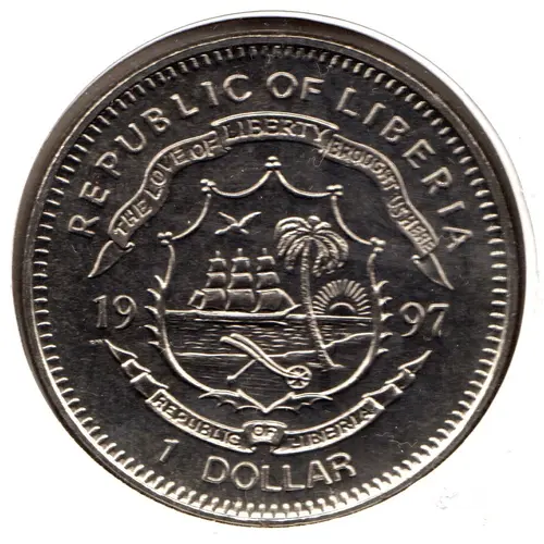| Obverse lettering | REPUBLIC OF LIBERIA THE LOVE OF LIBERTY BROUGHT US HERE 19 97 PM REPUBLIC OF LIBERIA 1 DOLLAR |