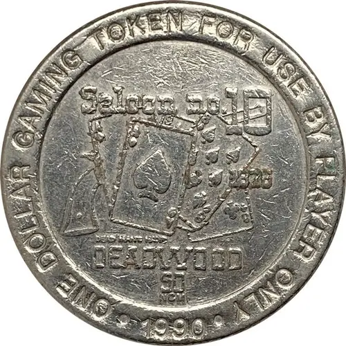 | Obverse lettering | ONE DOLLAR GAMING TOKEN FOR USE BY PLAYER ONLY Saloon no. 10 1876 DEAD MAN`S HAND DEADWOOD SD NCM 1990 |