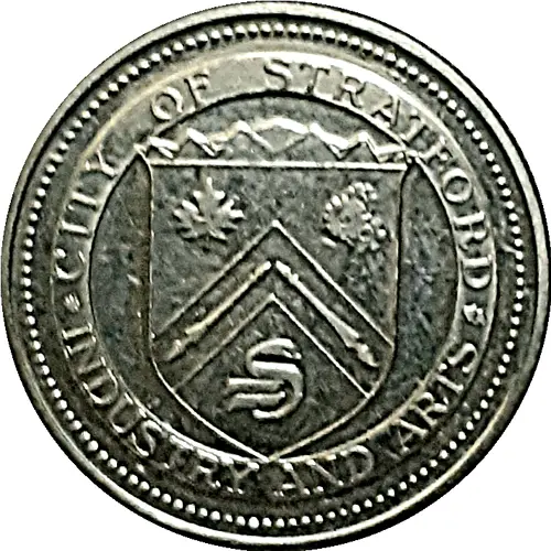 | Надписи аверса | CITY OF STRATFORD INDUSTRY AND ARTS |