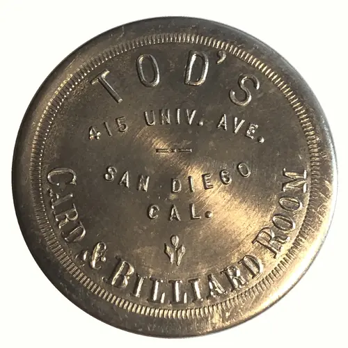 | Obverse lettering | TOD`S 415 UNIV. AVE. SAN DIEGO CAL. CARD & BILLIARD ROOM |