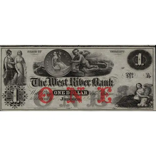 | Obverse lettering | STATE OF VERMONT The West River Bank Will pay ONE DOLLAR on demand to the bearer Jamaica, July 1st 18____ Cash Pres New England Bank Note Co. Boston. |