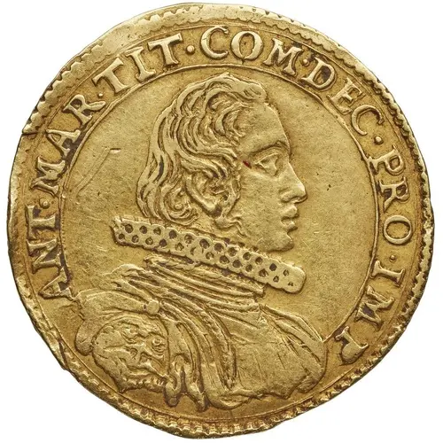 | توضیحات پشت سکه | Crowned shield of 4-fold arms with central shield of Tizzone family arms. |