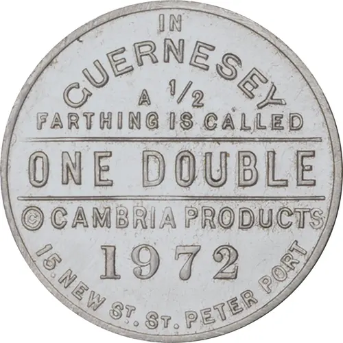 | 表面の銘文 | IN GUERNESEY A 1/2 FARTHING IS CALLED ONE DOUBLE © CAMBRIA PRODUCTS 1972 15. NEW ST. ST. PETER PORT |