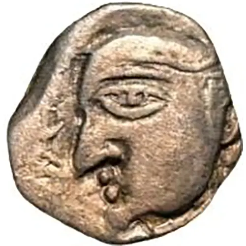 Obverse description Head of king left in maukhari style , wearing a simple crescent-topped crown