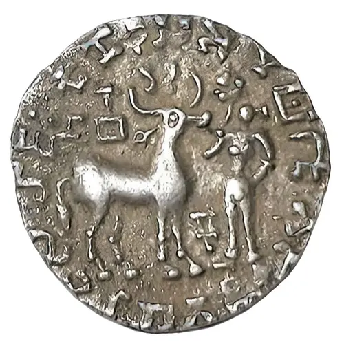 A deer standing to the right with a square-shaped vase above its back, an early Srivatsa symbol between its horns, Indradhaja between deer and godess Lakshmi, the goddess Lakshmi stands on the right field in front of the deer, facing forward, and holds a lotus flower with an upraised right hand, the Brahmi legend around the field, |