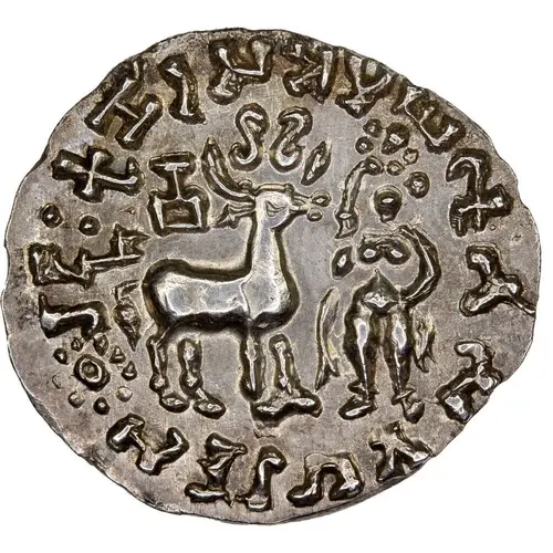 | Aversbeschreibung | Deer standing right, vase above & no symbol below the deer, sun behind the dear. Goddess Lakshmi with legend around (`Rajnah Kunindasya Amoghabhutisya maharajasya`). |