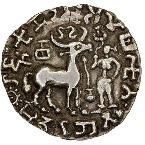 | Obverse description | Deer & Lakshmi holding lotus, srivatsa & vase, sun behind the deer and kalash (pot) between the deer and Lakshmi, legend around (`Rajnah Kunindasya Amoghabhutisya maharajasya`). |