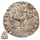 A deer standing to the right with a square-shaped vase above its back, an early Srivatsa symbol between its horns, Six-arched hill below deer, the goddess Lakshmi stands on the right field in front of the deer, facing forward, and holds a lotus flower with an upraised right hand, the Brahmi legend around the field, |