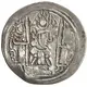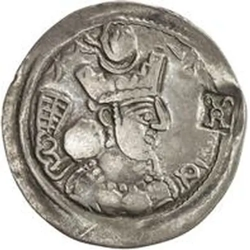 Figure with head of Ahura Mazda facing right within altar with attendants on either side. |