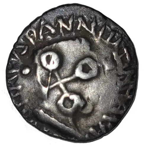 | Obverse description | Four orbed Ujjain symbols over old bust of Nahapana and lettering |