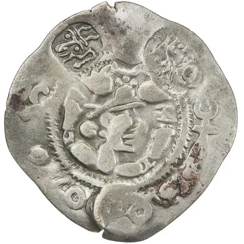 | Obverse description | Bust facing right with two different tamghas of the Kobadiens on either side and Bactrian legend below, all with obverse countermarks of types 1 and 2. |