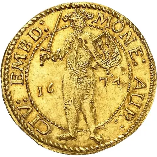 | Description de l’avers | Knight in armor with sword and Harpy shield, date seperated to sides. |
