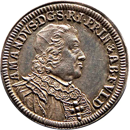 Historical Context: The 1744 silver pattern Ducat was issued under Amand of Buseck, Prince-Abbot of Fulda. As an Imperial Abbey, Fulda held significant temporal and spiritual power within the Holy Roman Empire, a period marked by complex ecclesiastical and secular authority. The issuance of a silver pattern for a denomination typically struck in gold suggests a trial or proposed change in monetary policy, perhaps for a commemorative issue or a new trade coin, reflecting the Abbey's economic aspirations or a test of new dies for future gold coinage.