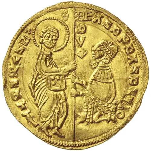 | Popis líce | St. Mark standing right and Doge kneeling left, holding banner between them. |