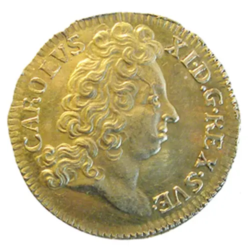 CAROLVS XI·D.G·REX·SVE· (Translation: Karl XI, by the Grace of God, King of the Swedes.) |