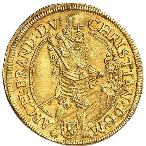Artistry: The artistry of this ducat typically reflects the stylistic transition from late Renaissance to early Baroque prevalent in German regional mints of the early 17th century. While specific engraver details are often unrecorded for such issues, the design likely features a dignified, realistic portrait bust of Margrave Christian on the obverse, rendered with period-appropriate regalia. The reverse commonly displays the Brandenburg eagle or a similar heraldic device, encircled by comprehensive Latin legends detailing the ruler's titles and the minting year. The overall aesthetic emphasizes regal authority and precise heraldic representation, characteristic of contemporary numismatic art.