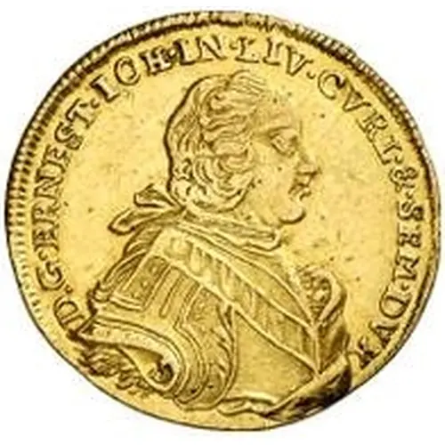 | Opschrift keerzijde | MONETA · AVREA · DVC · CVRLAND · 1764 · I · C · S · (Translation: Gold coin of the Duchy of Courland) |