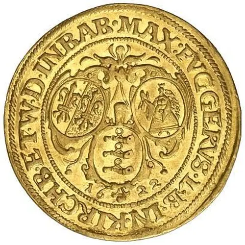 Artistry: While the specific engraver is unrecorded, this ducat reflects the Early Baroque numismatic style prevalent in German states. The obverse typically displays the elaborate armorial bearings of the Fugger family, often quartered with territorial claims, signifying Maximilian II's lineage and authority. The reverse commonly features a religious or Imperial motif, such as a cruciform design or the Imperial Eagle, accompanied by Latin legends detailing the ruler's titles and date. The execution aimed for clarity in heraldic detail.