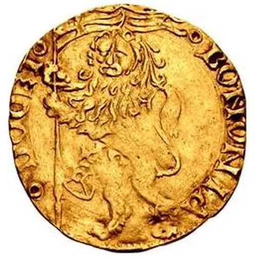 | Obverse description | Lion rampant left, holding banner; symbol to left |