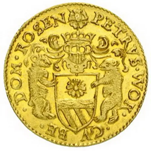 | Obverse description | Crowned Orsini-Rosenberg coat of arms with two bear supporters. Rose at the top, lettering around. |