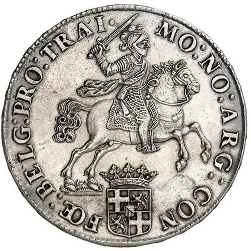 Obverse description Armored knight brandishing sword with right hand, on charging horse to right above crowned quartered arms of Utrecht province with small city of Utrecht shield at center.