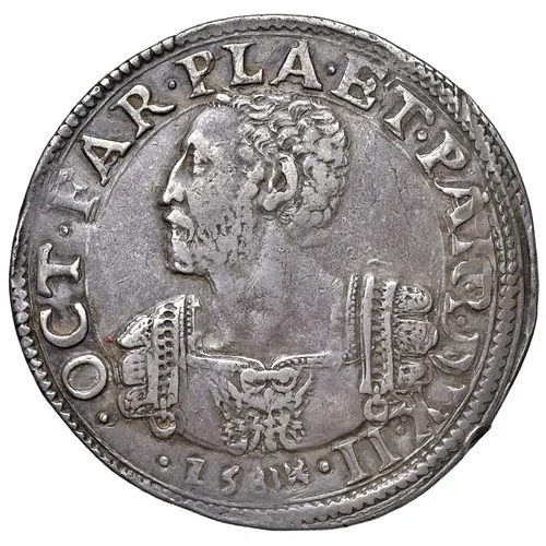 | Reverse description | Coat of arms of Octavio Farnese within shield below crown, flanked by the Municipal Arms of Piacenza. Engravers initials flank the shield below |